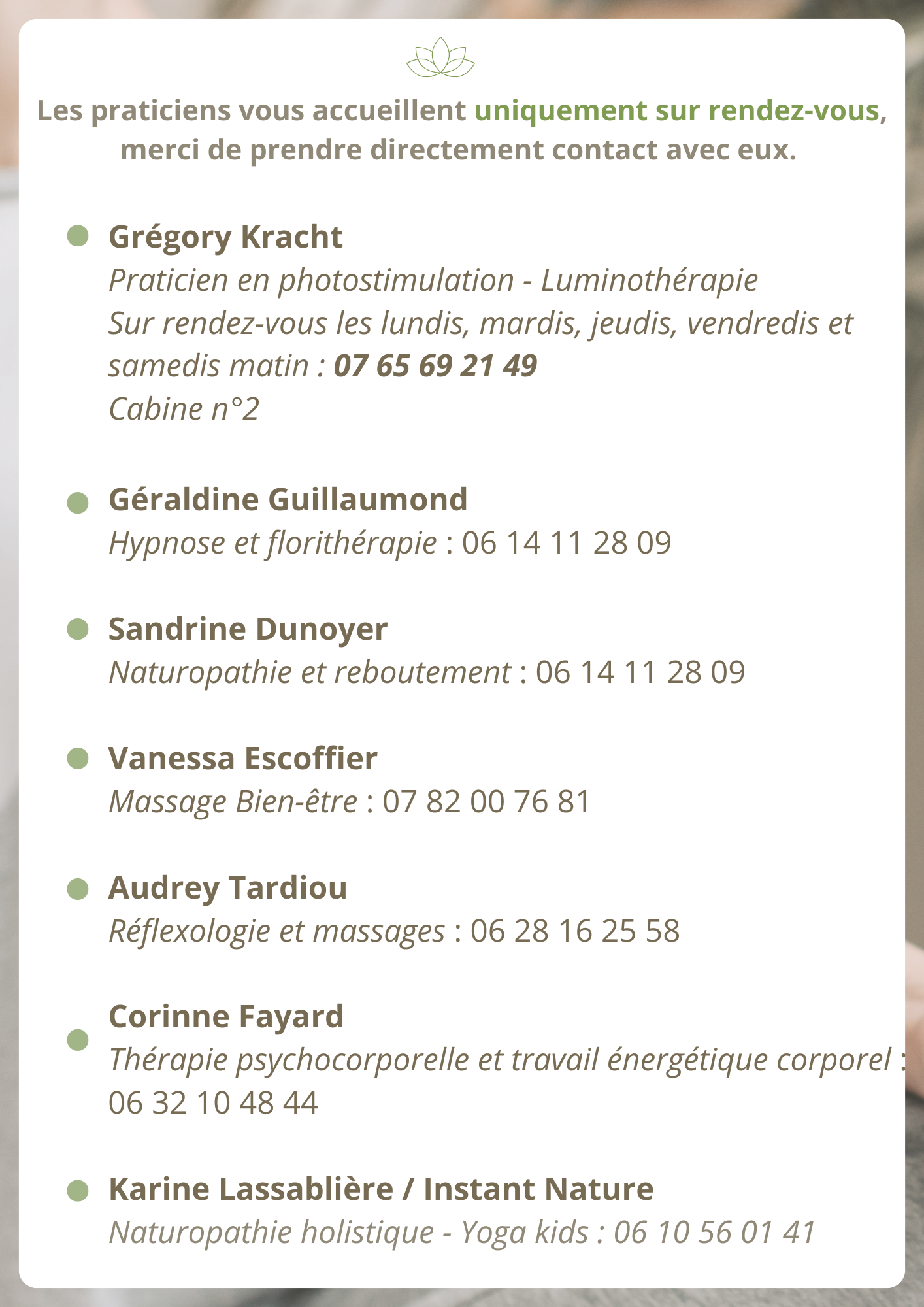 Cabine 1 Cabine 2 Un espace de travail professionnel mutualisé qui permet de limiter vos charges. Une formule souple et flexible qui s'adapte à vos besoins et votre quotidien. Après étude de votre dossier et la création de votre compte, vous pourrez recevoir vos clients dans un espace de travail professionnel, adapté et entièrement dédié à votre activité. Installer son cabinet et intégrer une communuté 2 matinales des professionnels du bien-être sont organisées dans l'année. 1 temps dédié au réseau et l'échange de pratique : Automne